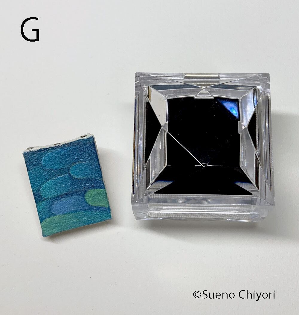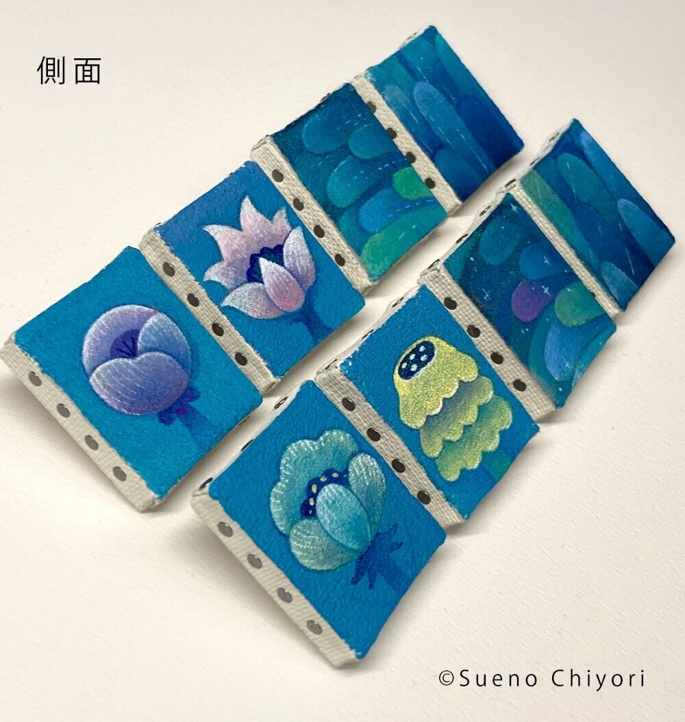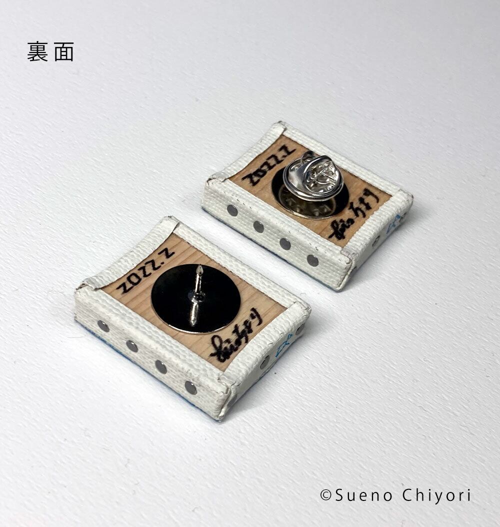 縦3㎝、横2.5㎝、厚み6mmの木材の板に画材用のキャンバスを接着・釘止めし、バッジ金具やストラップ等を取り付けた張りキャンバス。今後、間伐材の活用にも取り組んでいきます。